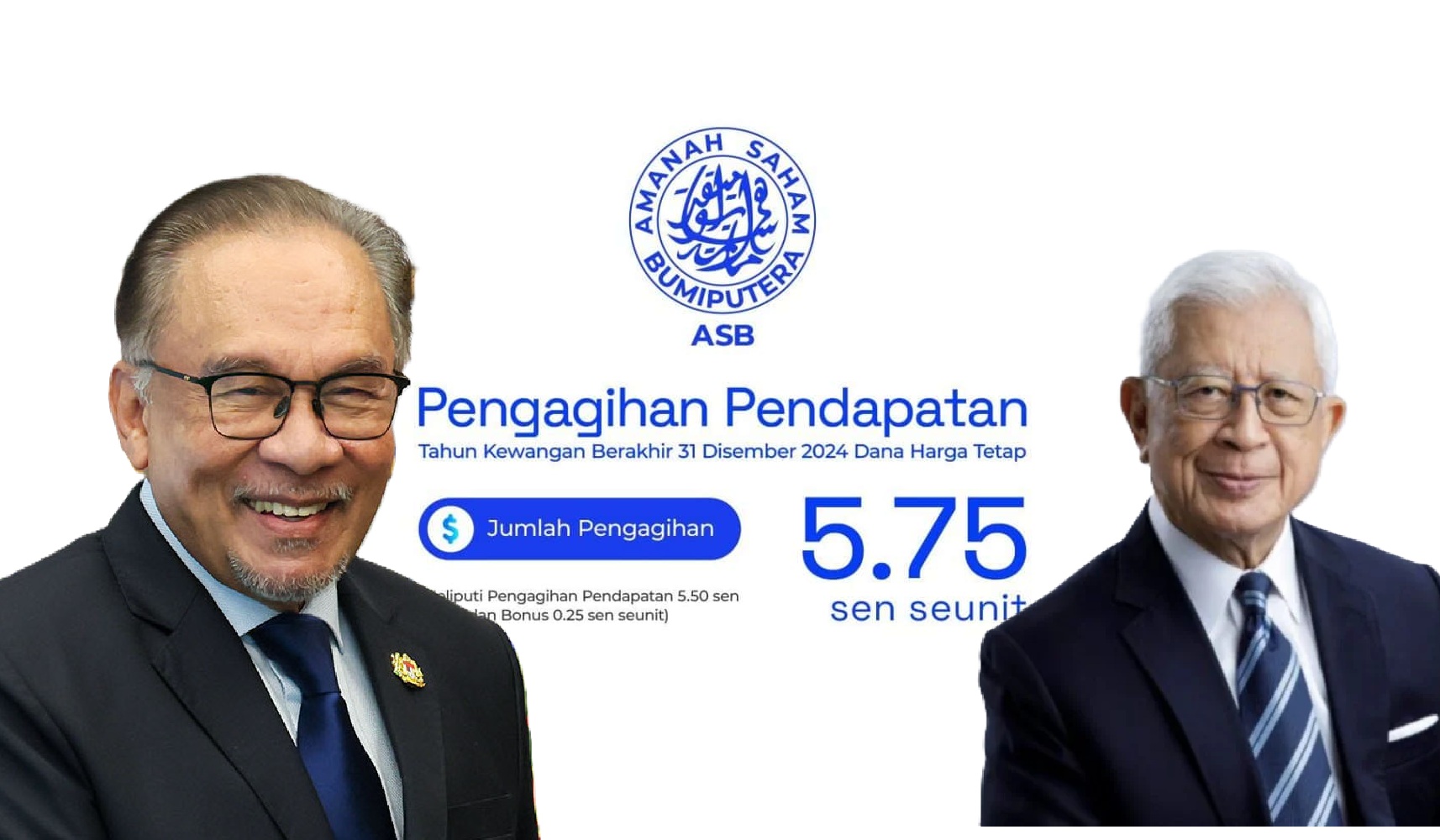 Amanah Saham Nasional Bhd (ASNB), syarikat pengurusan unit amanah milik penuh Permodalan Nasional Bhd (PNB) mengumumkan jumlah pengagihan pendapatan sebanyak 5.75 sen seunit untuk dana utamanya, Amanah Saham Bumiputera (ASB) bagi tahun kewangan berakhir 31 Disember 2024.